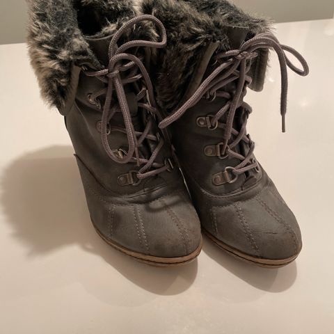 Lämmin karvavuori, pitävä pohja ja hieman leveämpi lesti. Vetoketju sisäsivulla.