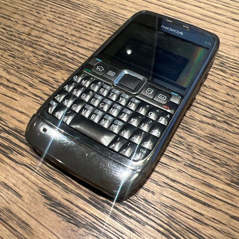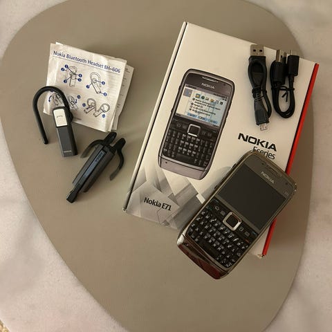 Nokia E71 puhelin. Mukana laturi, langalliset korvanapit, käyttöohjeet ja alkuperäinen laatikko. Puhelimen kamera ei enää toimi. Toimituskulut lisätään.