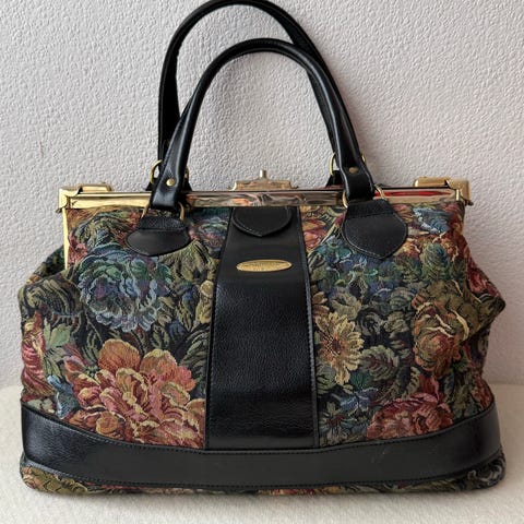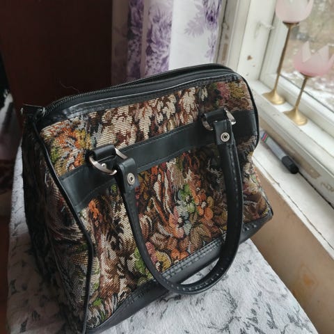 Gobeliinilaukku 90-luvulta, uusi, mukana pitkä hihna, kok 37x32x9cm. sisäkangas kullankeltainen, ulkopuolella iso vetoketjullinen tasku, sisällä myös vetoketju tasku. Taustapuoli musta.