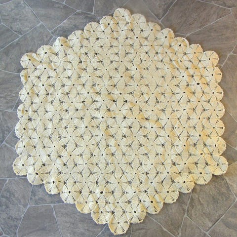 Kotimainen käsityö , virkattu pitsiliina, luonnonvalkoinen kalalanka.. Sopii pöytäliinaksi tai keinutuoli vaatteeksi. Materiaali on puuvillaa, joka antaa liinalle kestävyyttä ja luonnollisen ilmeen.
