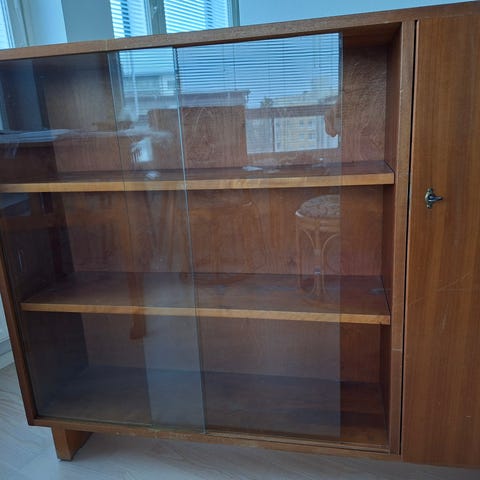 60-luvun teak-viilutettu kirjahylly. Kaapin ylä pinnassa kukkaruukun jälki ( kuvassa) . Hyllyn korkeus 210 cm, leveys 83 cm ja syvyys 36 cm.