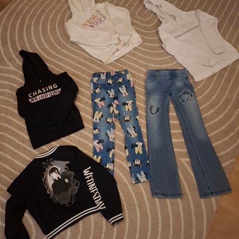 Myydään hyväkuntoinen vaatesetti, suurinosa kokoa 134-140cm. Myös muutama 146cm kokoinen vaate. (yhdet treenishortsit koko 128cm vaan ollut yhtäaikaa käytössä). Osa vaatteista todella hyvässö kunnossa ja osassa enemmän kuluneita mm leveälahkeiset farkut kuluneet kauttaaltaan. Mukana mm pari kappahl ribbi t-paitaa, metsola paitoja, Harry Potter trikoopipo, adidas huppari, pörrö huppari...