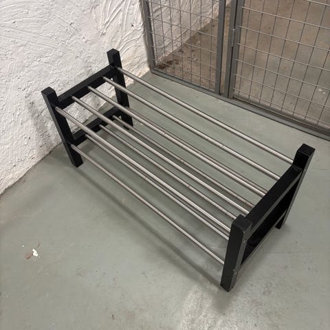 Hyväkuntoinen ja simppeli kenkäteline. Paikoittaista tummumaa metalliputkissa.
