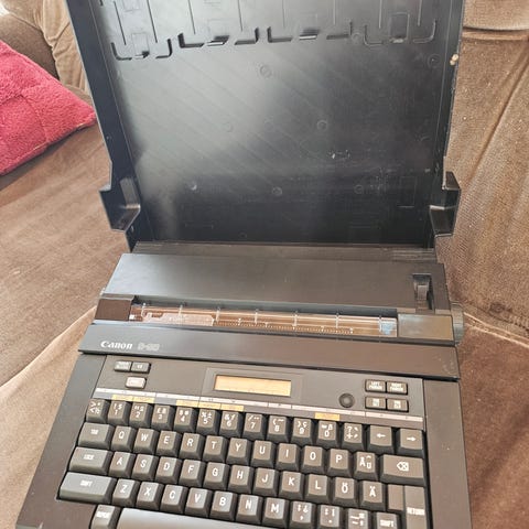 Canon QS 100 sähkökirjoituskone vintagea. Virta kytkeytyy ja näppäimet toimivat, mutta vaatii uuden värinauhan. Ei testattu tarkemmin, mutta oletettavasti täysin toimiva.