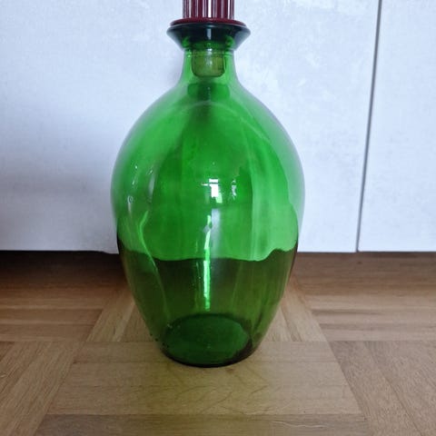 Vihreä lasipullo, pyöreä muoto, suuri suuaukko. Sopii koristekäyttöön tai säilytykseen. Korkeus n. 46 cm ja halkaisija n. 35 cm