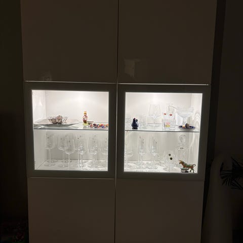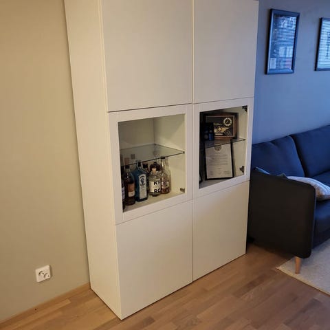 Ikean BESTÅ vitriinikaappi. Valkoiset kiiltävät ovet ja vaalean rusehtava runko. Käytön jälkiä toisessa sivussa vähän ja sisältä yhdestä kulmasta pieni pala lähtenyt. Kaapit saa jotenkin irrotettua toisistaan, helpottaa kuljetusta. Ja ovet myös parilla ruuvilla. Kokonaisena todella hankala liikuteltava. Tarjotakkin saa, mutta noin 500€ uutena.