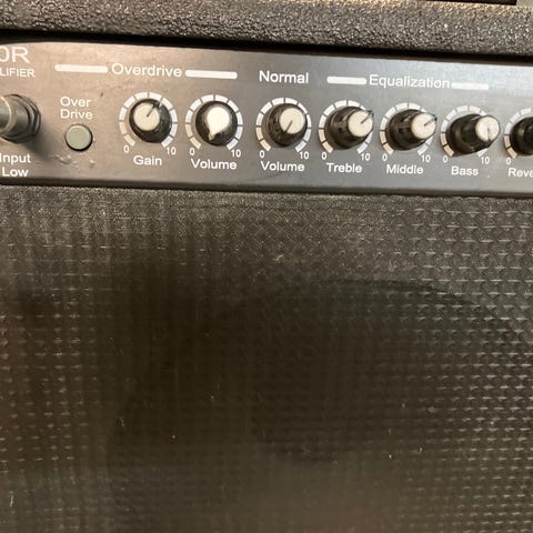 Harley Benton HD-25B kitaravahvistin, jossa on äänenvoimakkuuden ja neljän kaistan taajuuskorjaimen säädöt (Low, Mid 1, Mid 2, High). Mukana mikrofonikaapeli ja mikrofoni.