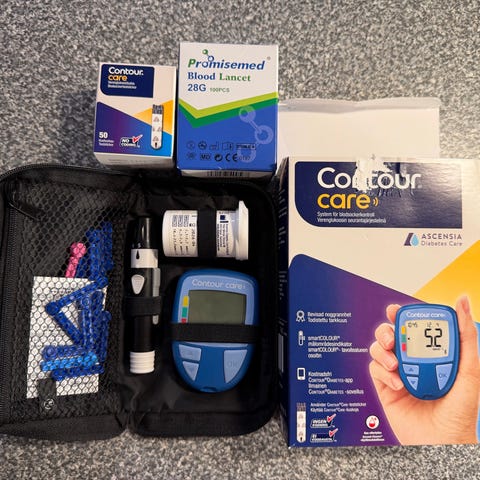 Tarpeettomana avaamattomassa pakkauksessa oleva verensokerimittari (2021-12). Mukaan tulee myös avaamaton pakkaus Contour Next verensokerin mittausliuskoja (31.03.26) sekä 10 lansettia sekä vara patterit mikäli pakkauksessa olevat paristot ovat vanhentuneet. Liuskoja sekä lansetteja saa ostettua apteekista.