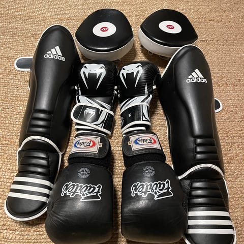 Potkunyrkkeily setti eli venum jalkasuojat ihan uudessa kunnossa pari kertaa käytetty ja sit outshock 14oz nyrkkeily hanskat ja sit fight naamasuoja. Hinta ei kiveen hakattu mutta hyvä setti ei hirveesti käytönjälkiä. Vain nouto!