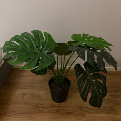 Monstera kasvi mustassa ikea altakasteluruukussa, jossa suuret vihreät lehdet. Sopii sisätiloihin koristekasviksi.