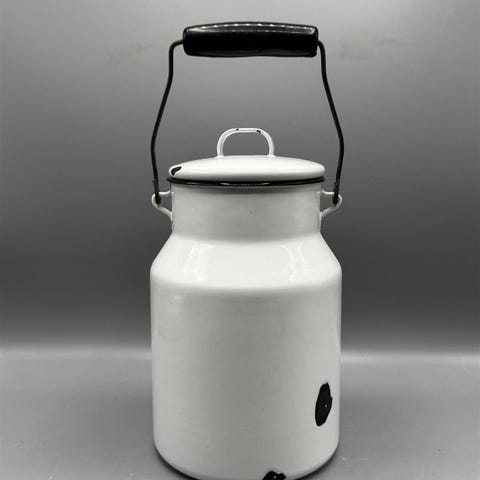 Kellertävä vintage emalikannu, jossa on vihreä kahva. Kannu on valmistettu metallista ja siinä on kaareva muotoilu, joka tuo esiin sen vanhan ajan viehätyksen, pinta emaloitu. Sisäpuolella on havaittavissa käytön jälkiä ja tummentumia, jotka kertovat sen historiasta.