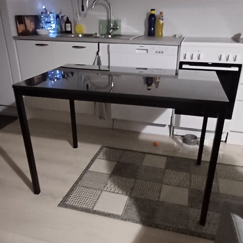 Kiva pienempään keittiöön sopiva ruokapöytä kalustelevyä. Pöytätaso on tammijäljitelmää. Valkoiset reilun levyiset jalat.