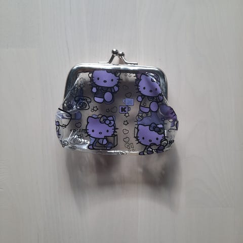 Musta samettipintainen kukkaro, jossa toisella puolella hopean sävyinen Hello Kitty -kuvio. Mitat enimmillään noin 9 x 12 cm. Mukana avainrengas. Jäänyt käyttämättä, kunto uutta vastaava.