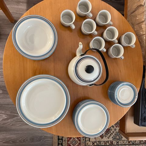 Teekuppipari 8 kpl, kahvikuppipari 6 kpl, tarjoilulautaset 10 kpl, tarjoiluastioita 2 kpl.