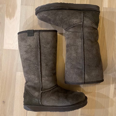 Muutaman kerran jalassa olleet, nyt harmikseni itselle liian pienet. Kenkiä tarkemmin kuvatessa huomasin pohjan reunassa pienen raon molemmissa kengissä noin parin sentin matkalta. Toisen kengän reuna taittuu ulospäin, ollut säilytyksessä huonossa asennossa. Ei kulumaa villavuoressa.