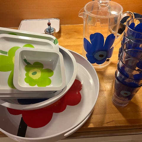 Marimekko Unikko tarjotin, jossa on valkoinen pohja ja vihreä kukkakuvio. Tarjotin on valmistettu kestävästä materiaalista ja soveltuu keittiö- ja tarjoilukäyttöön.