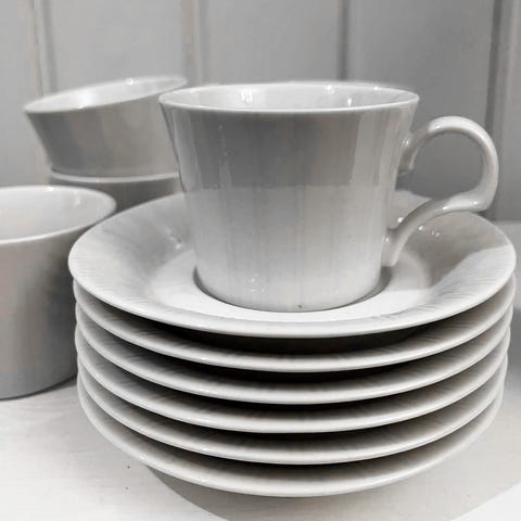 Arabia Luumi kahvikuppi ja lautanen valkoisessa värissä. Posliinimateriaali. Sarja soveltuu kahvin tarjoiluun.