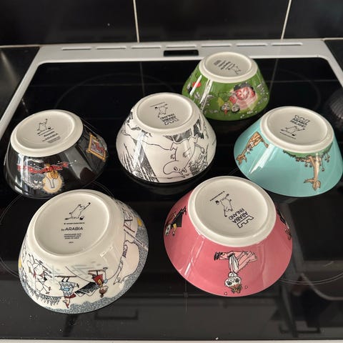 Arabia Muumi kulhot 13 kpl. Muutama leipälautanen löytyy myös eri ilmoituksella. Nouto Ilmarinen. Hp yhteensä 100€. Yksittäin 10€/kpl