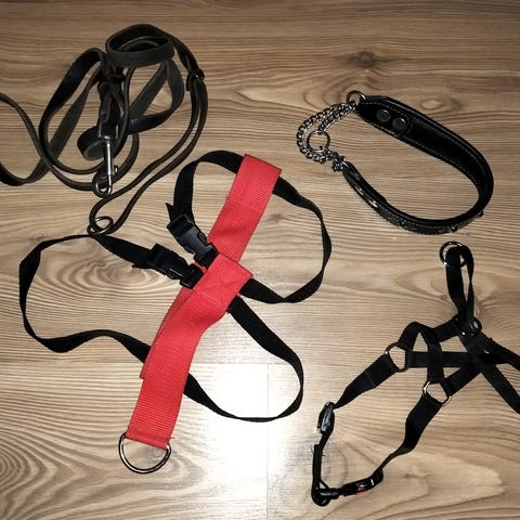 Koiran ulkoilutarvikkeita (hihnoja, valjaita, pantoja, jne)