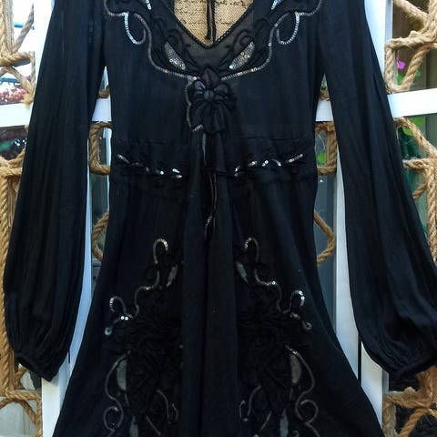 Musta Dorothy Perkins -merkkinen tunika/mekko, jossa valkoinen Peter Pan -tyyppinen kaulus. Kauluksessa kristallikoristeet.