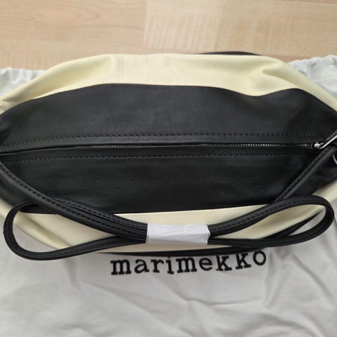 Käyttämätön Marimekon Karla Multi -olkalaukku. Mustavalkoinen. Muutama ihan minipistejälki, jotka olleet jo alunperin.