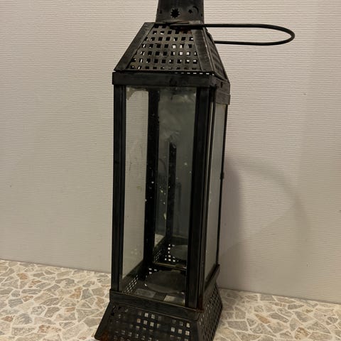 Annetaan musta metallinen lyhty. Korkeus noin 37cm (+ kahva). Muuten ehjä mutta yhdeltä sivulta lasi puuttuu puoliväliin asti (kuva).
