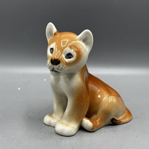 Keraaminen leopardipatsas, jossa on täplikkäitä kuvioita. Patsaan pohjassa on merkintä 'Lomonosov leima ja MADE IN USSR'. Patsas on hyvässä kunnossa ilman näkyviä vaurioita.