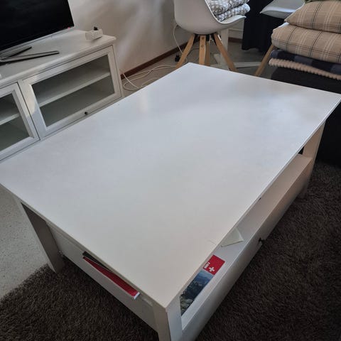 Myydään Rowicon valkolakattu, tamminen sohvapöytä. Pinnassa haaleita käytön jälkiä.