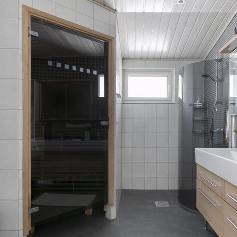 Suihkunurkkaus, jossa on lasiovet ja suihkuvarustus. Sopii kulmakaappina käytettäväksi kylpyhuoneessa. Materiaalina lasi ja metalliosat. Väri kirkas läpinäkyvä lasi ja valkoinen pohjalevy.