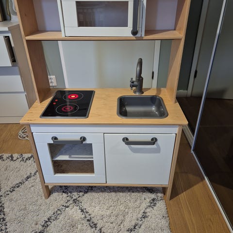 IKEA lasten leikkikeittiö puuvalmiste. Keittiössä on liesitaso, allas ja hana sekä useita kaappeja ja hyllytilaa leikkimistä varten.