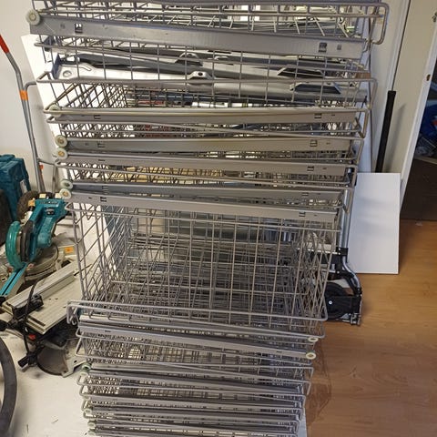 22kpl kiskoilla olevat korihyllyt.Hyllyt ovat hyväkuntoisia.