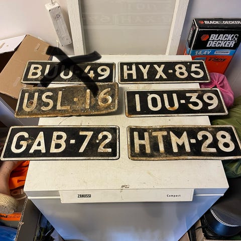 Vanha rekisterikilpi, ajan patinaa ja historian havinaa. Musta tausta, valkoinen teksti ja numerot. Kilvessä näkyy yksilölliset tunnukset, Viipurin läänin kilpi kyseessä.
