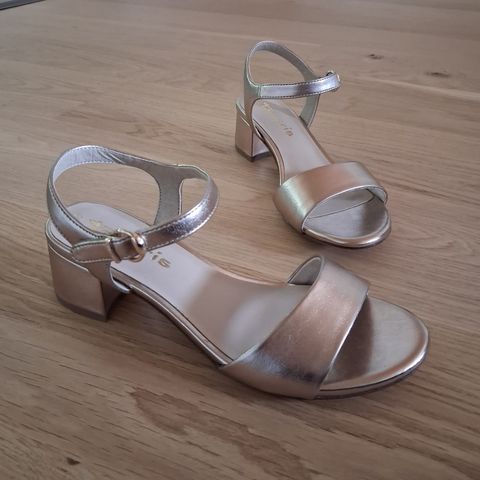 Tamaris Jessa juhlakengät, koko 37.Väriltään (04 Pearl) vaaleat ja hieman kimaltavat, solkikiinnitys nilkan ympärillä. Korko on noin 5cm.