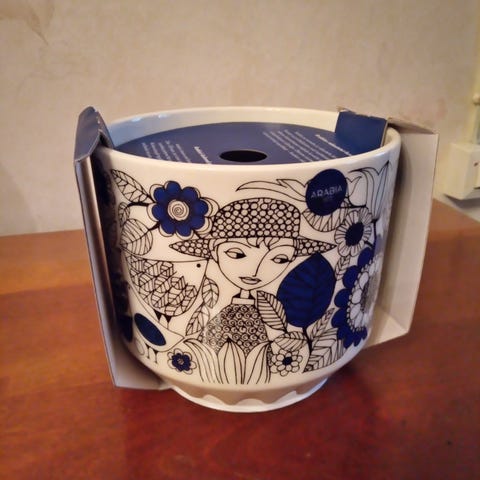Arabia 150, Pastoraali ruukku, halkaisija 140 mm ja korkeus 125 mm. Design Esteri Tomula. Ei kolhuja. Myynnissä myös muualla.