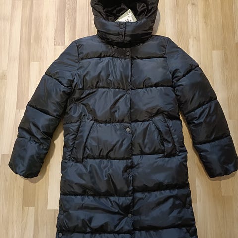 Ehkä muutamasti päällä käynyt H&M musta toppatakki. Malli kapeahko.