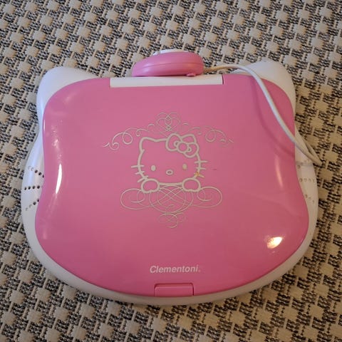 Hello Kitty lasten lelupuhelin, jossa on valkoinen ja vaaleanpunainen väri. Lelu on muovinen ja suunniteltu lapsille leikkikäyttöön.