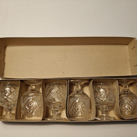 Kuusi kappaletta kristallilaseja alkuperäisessä pakkauksessa. Lasin korkeus noin 10cm.