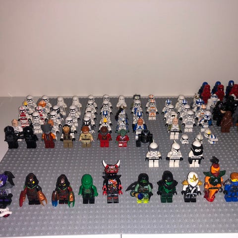 LEGOn erilaisia hahmoja ja rakennussarjoja. Sisältää myös muita legoja.