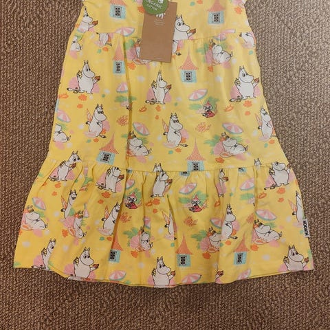 Moomin veluurinen sadepäivä mekko kokoa 92, kunnoltaan kuin uusi. Kerran tai kaksi oli käytössä. Ihanan pehmeä ja nätti päällä.