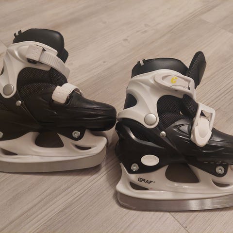 Säädettävä koko 27/30. Pohjallisen mitta n. 18.9 cm (kts. kuva). 6v lapsella ollut käytössä. Terät ihan hyvässä kunnossa.