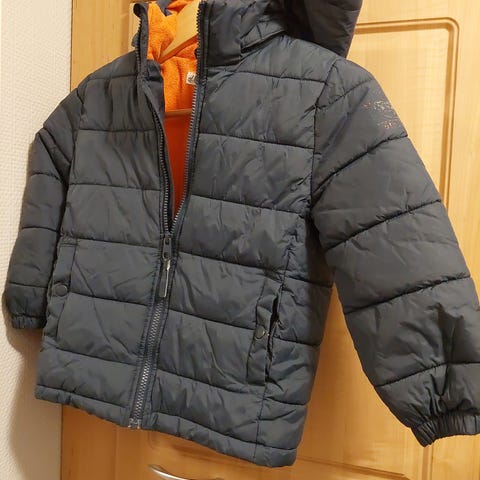 Lasten sininen toppatakki, koko 116 cm. Huppu hävinnyt. Sijaitsee Espoon Niipperissä,kulkeutuu myös Myyrmanniin.