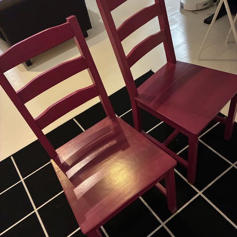 Myydään puiset (kevyet) tuolit. Kalkkimaali lohkeillut pinnasta, mutta muuten tuolit ovat kunnossa.