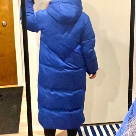Musta kiiltavä pinta, huppu, soljellinen vyö. kaksi upotettua taskua. Turkoosi vuori. Pituus 95cm. koko 44. Maksoin 195€.