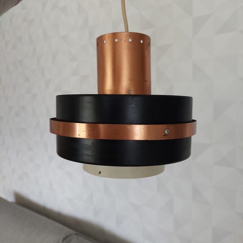 Yki Nummen Innoluxille suunnittelema tyylikäs klassikko, savun-/siniharmaa Kuplat 400 kattovalaisin. Yläkartio himmeää pronssia, johto n. 2 m valkoinen muovi, pyöreä kiinnityskupoli, helppo koukkukiinnitys pistoketulppineen.