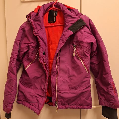 Didriksons toppatakki, kokolapussa 150, mutta reilu koko (vastaa mielestäni 158/164). Väri taittaa ruskeaan, ei kirkas oranssi, vaikka kuvassa näyttää siltä. Takin ainoa miinus on naarmu edessä, näkyy kuvissa.