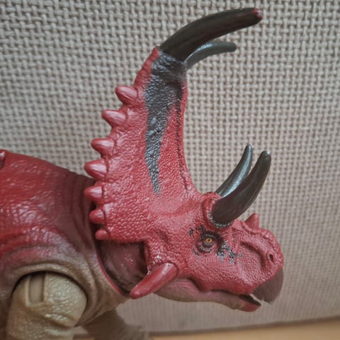 Mattelin valmistama Jurassic World ruskean ja tummanruskean sävyissä oleva dinosauruslelu ampelosaurus. Lelun pituus noin 36cm. Kunto uudenveroinen. Kylkipiikin alla myös koodi jurassic world play-peliin. Dinon hännän nappia painamalla suu sulkeutuu. Pelkkää häntää liikuttamalla ylös ja alas myös niska taipuu ylös ja alas. Liikkuvat raajat. Tässä dinossa ei ole patteritoimintoa eikä ääntä. Tämä lelu vuodelta 2021.