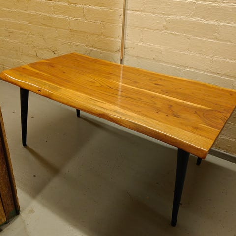 Japanilaistyylinen matala sohvapöytä. Tietääkseni materiaali on kumipuuta ja pöytä vaikuttaa laadukkaalta. Joitain käytön jälkiä ja yksi tahra sekä erittäin pieni pullistuma. Siksi kuntoluokka on vain kohtalainen. Pöytä on kuitenkin todella hyväkuntoinen ja siistinä pidetty. Hyvä viimeistely pinta, helppo pyyhkiä ja pitää puhtaana. Pöytä sijaitsee Kampissa