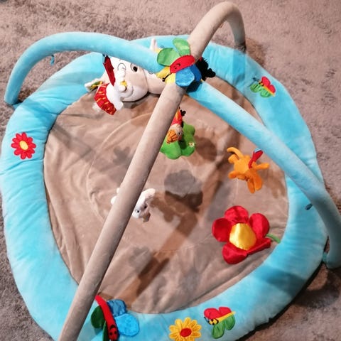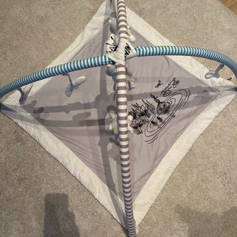 Käytettynä ostettu ja meillä kahdella vauvalla käytettynä ihana Muumi leikkimatto, mukaan pitäisi löytyä ainakin 3 lelua.
