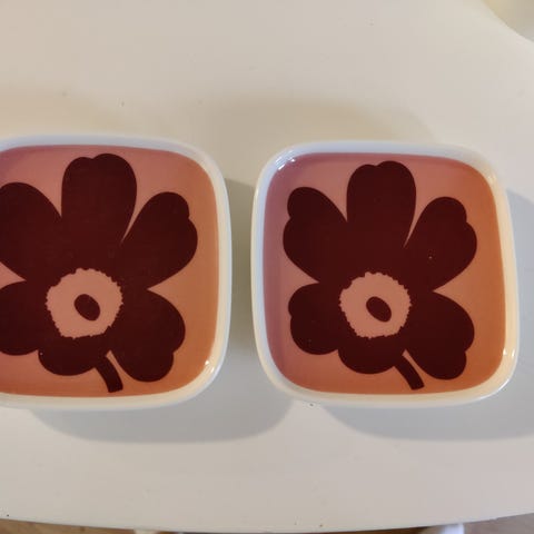 Marimekon punaiset posliini lautaset, 6 kappaletta, Lautaset ovat neliön muotoiset (23 x 23 cm).