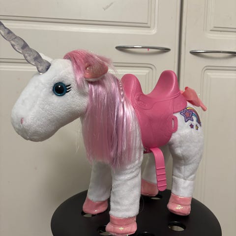 Baby Born Yksisarvinen / hevonen, valkoinen ja vaaleanpunainen väri. Pehmeä materiaali. Toimii paristoilla, korvia painamalla kuuluu musiikkia tai heppa liikkuu. Toimiva, siisti ja ehjä. Mukaan kuuluvat satula ja kaksi pinniä.